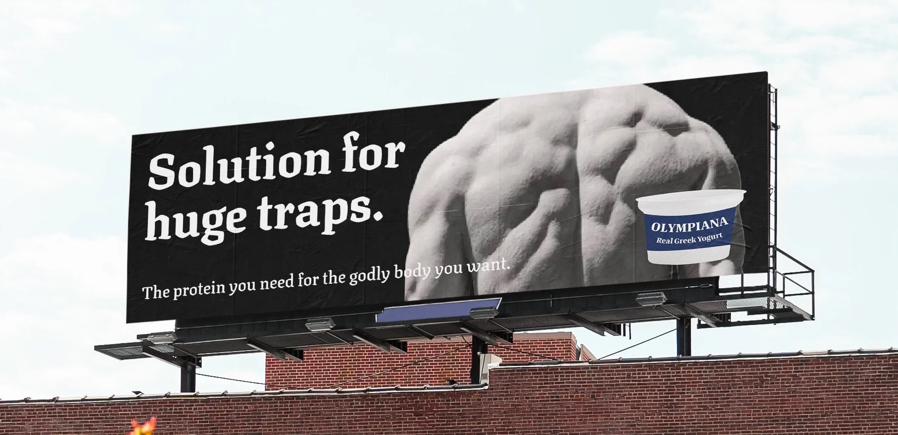 Positioning this ad in a magazine will allow readers to learn about how they can achieve glutes like these from Olympiana Greek Yogurt. While consumers of other yogurt brands might not understand why they should switch to Olympiana, the information and visual of Hercules glutes provided show their first step to ultimate gains is with this authentic Greek yogurt and can be accessed through their website.